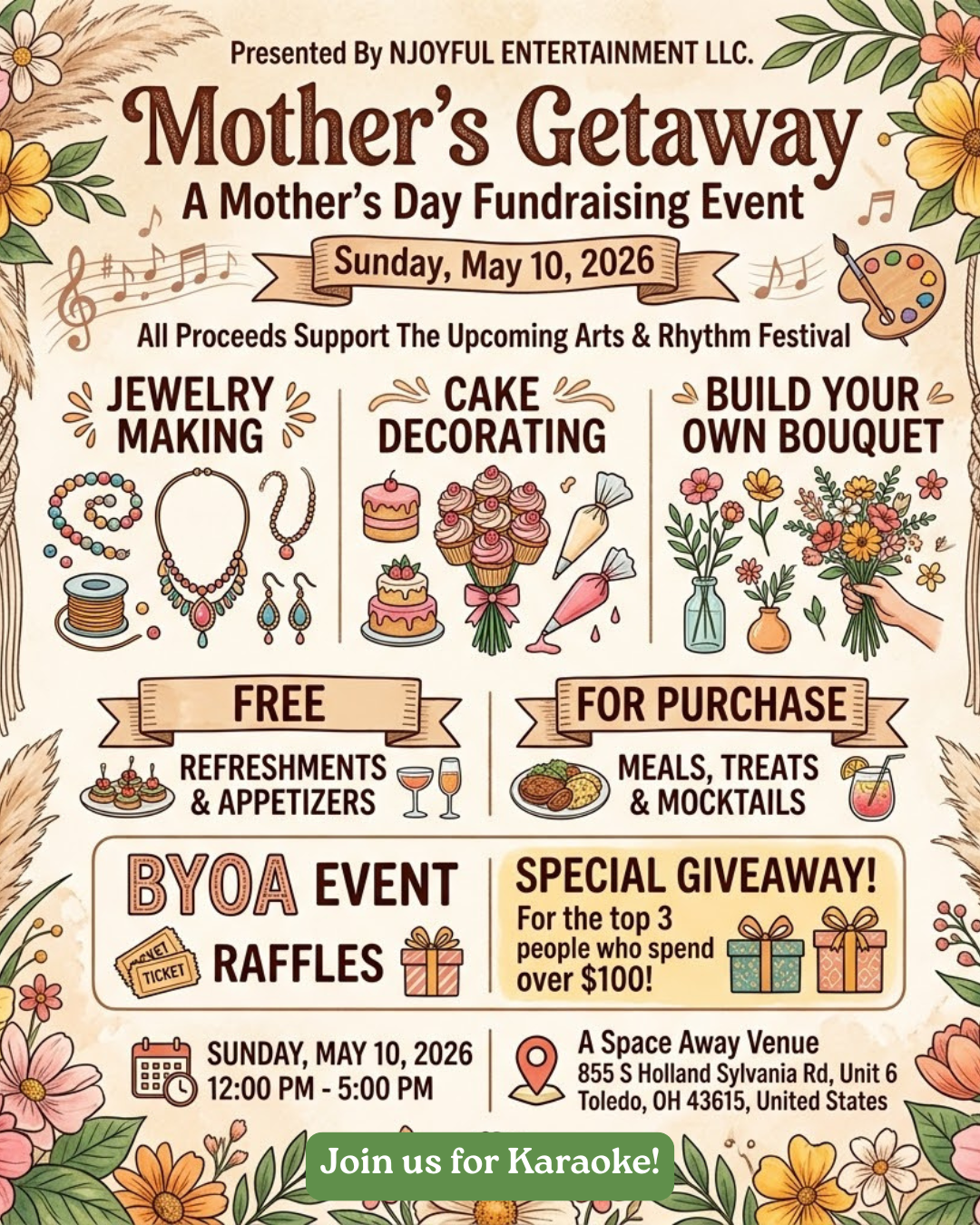 Join us for a hands-on celebration of creativity, featuring jewelry making, floral bouquet building, and guided cake decorating. We are rounding out the afternoon with community karaoke—all while gathering the resources needed to power the upcoming Arts & Rhythm Festival.